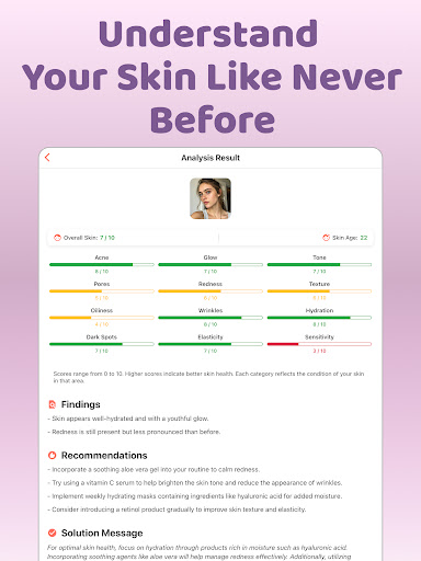 Analyze your skin with our advanced AI-powered skin scanner. Obtain detailed scores on acne, pores, wrinkles, and oiliness. Get tailored solutions, actionable insights, and expert recommendations to address your special skin concerns.